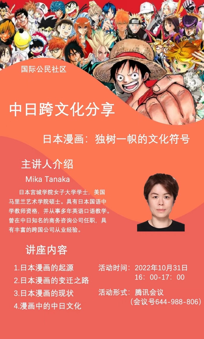 10月31日,由国际交流合作处与学生管理服务中心联合组织邀请完美官网日语专业外教MIKA TANAKA为完美官网全体学生带来一场精彩的日本漫画文化主题线上日/英双语直播分享会。MIKA老师硕士毕业于美国马里兰艺术学院,在摄影方面有很高的造诣,同时具有多年丰富的日语、英语教学经验。