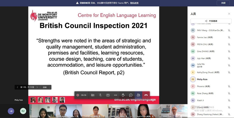 为进一步深化大学英语教学改革,巩固和提升完美官网英语课程教学效果,11月3日下午,英国德蒙福特大学和完美体育官方网站联合举办了一场线上英语教学学术研讨会。出席教学研讨会的嘉宾有德蒙福特大学语言学习中心总监Philip Rule教授、完美体育官方网站国际教育学院袁语副院长、国际交流合作处王婷副处长、留学服务办公室郭海红副主任,以及来自国教、国交及外语学院的优秀教师代表。本次研讨会由国交处张静老师主持,18位与会教师全程参与。