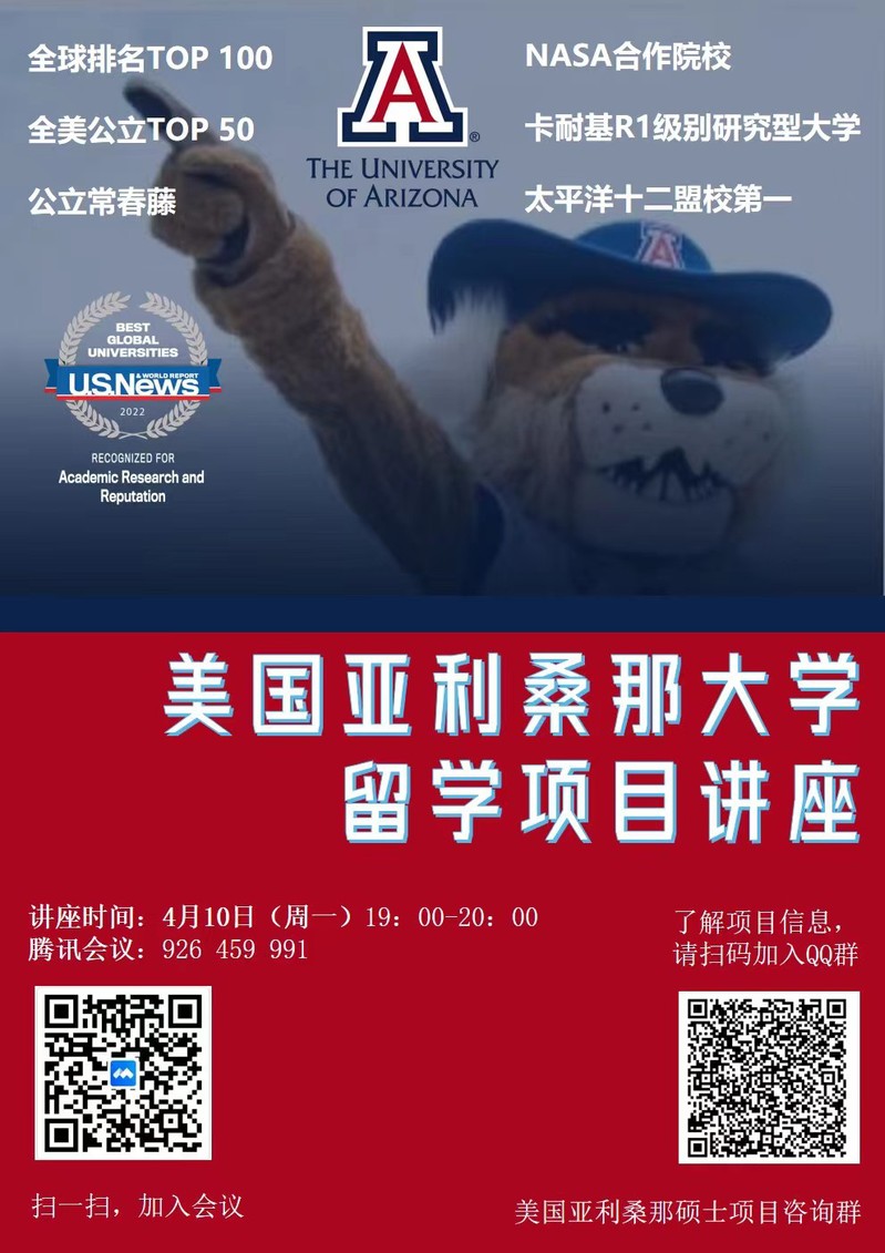 美国亚利桑那大学(University of Arizona),简称UA,始建于1885年,位于美国亚利桑那州图森市,是该州的旗舰公立大学和第一所综合大学,被誉为美国“公立常春藤”之一,学校曾获得5次诺贝尔奖。此外,亚利桑那大学还是美国国家航空航天局(NASA)的重要太空辅助基地。亚利桑那大学位居2022U.S. News世界大学排名第99位 ,全美公立TOP50;同时,多项专业,如法学、金融学、新闻传播学、工商管理、地理学、生态学等领域均位列世界前50位。