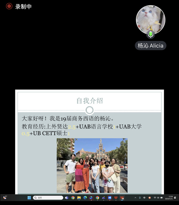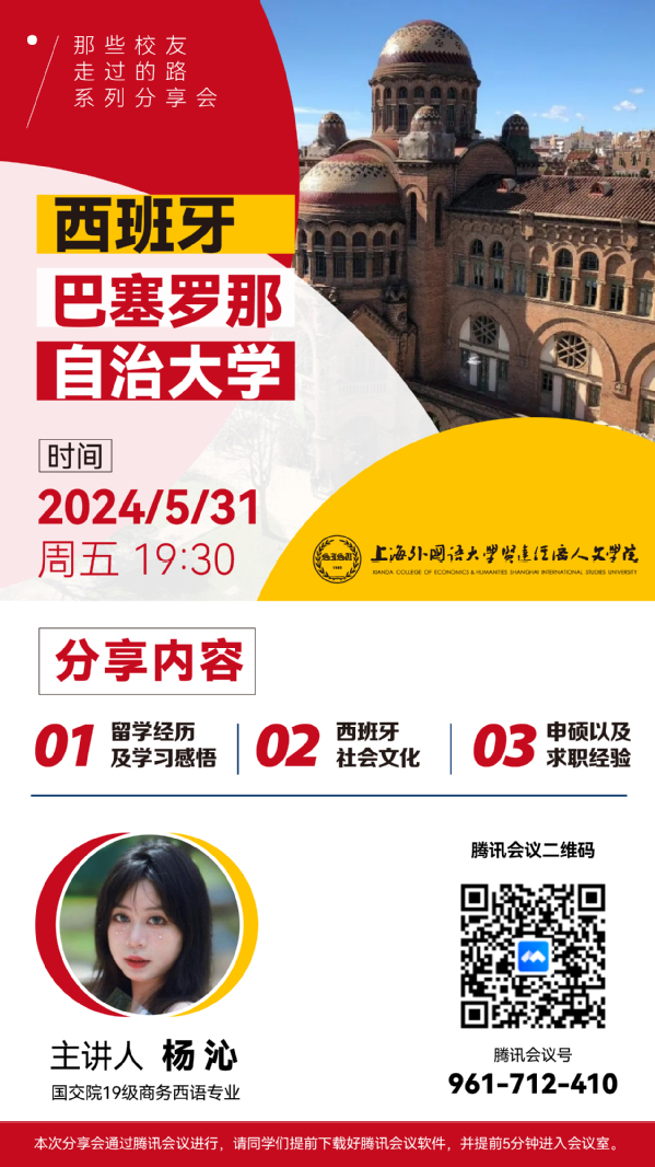 为进一步拓宽在校学生的全球视野,加强中外文化交流互动,国际交流合作处再次邀请完美官网在各国、各领域发展杰出的校友,精心策划并启动举办“那些校友走过的路——世界名校篇”的系列线上主题分享会,分享他们的海外求学经历、职场经验等宝贵心得,助力在读学生们科学规划未来的留学计划,并合理地确定职业发展方向。5月31日,我们邀请到国际交流学院西班牙语(商务)专业2019级毕业生杨沁同学作为本期西班牙方向主讲嘉宾,为同学们带来了一场精彩纷呈的线上交流分享会。该同学参加了完美官网与西班牙巴塞罗那自治大学联合举办的2.5+1.5+2本硕连读项目。