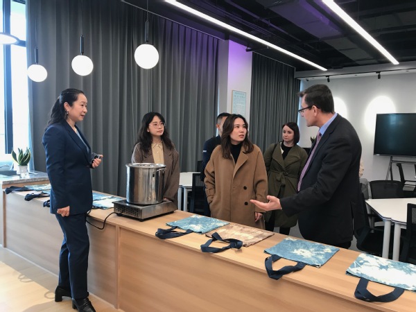 桑德兰大学代表团抵达后,在艺术与传媒学院副院长许月兰、院长助理万欣、国际交流合作处处长王婷、留学服务办公室副主任郭海红等陪同下参观了新文科实验实训中心的各类实验实训室:首先是数字科学与艺术研究实验室,展示了艺传学院开发的虚拟现实(VR)项目—《龙门回响》,展览通过现代科技展现龙门石窟的历史与文化,让参访者沉浸在龙门石窟壮丽的雕刻和古代艺术的体验中;接着是老字号品牌教研展实验室,通过高科技手段呈现本土品牌的发展历程和经典瞬间;最后是色彩与光环境实验室,展示了师生完成环境设计中光环境设计的空间。