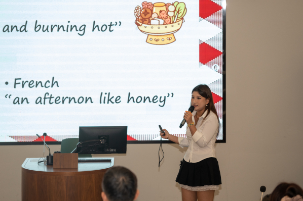 随后,10 支团队围绕各课程主题带来各具特色的英语讲演。在本次活动中,各团队展现出丰富多元的主题视角。The Alliance of Brave以非遗 “打铁花”技艺为主题,讲述人物故事,传递勇气与坚韧之力;E - njoyers聚焦波兰文化与商业;Dahlia Blossom探讨飞行服务发展及移民影响;Revoice剖析中国电影英文翻译中的文化内涵流失问题;Floral Elegy借河流与花朵等意象揭示父权压迫;Rising One呈现中国夜市特色;Four Golden Flowers分享艾米莉・勃朗特的诗作及其中蕴含的精神力量;The Gavel Gang围绕荔枝挖掘文化寓意;Indo - KNIGHTS关注中国 - 印尼合作中的商务礼仪要点;Synergy Stars则带领观众领略诗歌中食物作为情感与文化载体的魅力。
