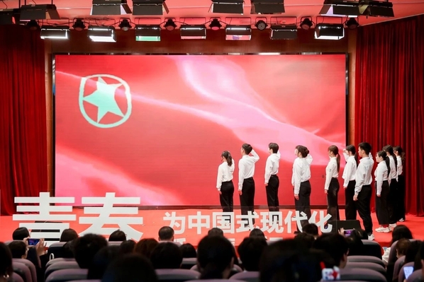 话剧社与主持队联袂演绎的《热血五四青春中国》片段,重现百年前青年的赤诚担当,引发全场青年共鸣;新发展团员面向团旗庄严宣誓,以掷地有声的誓言诠释对党的忠诚,立志在强国征程勇当先锋。