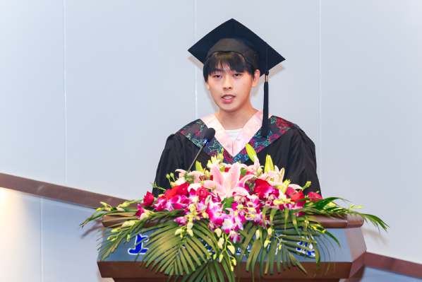 毕业生代表外院学院日语专业21级学生邵圣博回顾了在贤达学院求学的时光,感恩母校赋予的专业素养与创新精神。他代表全体毕业生向母校和敬爱的师长们致以最崇高的敬意和最真挚的感谢,希望每位毕业生都能在各自的领域发光发热,奔赴属于自己的星辰大海。