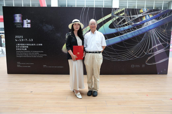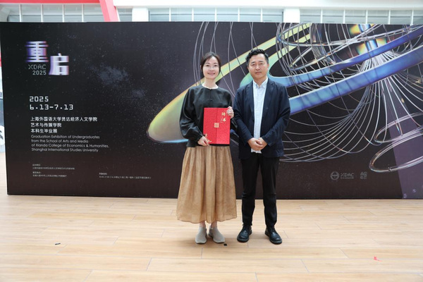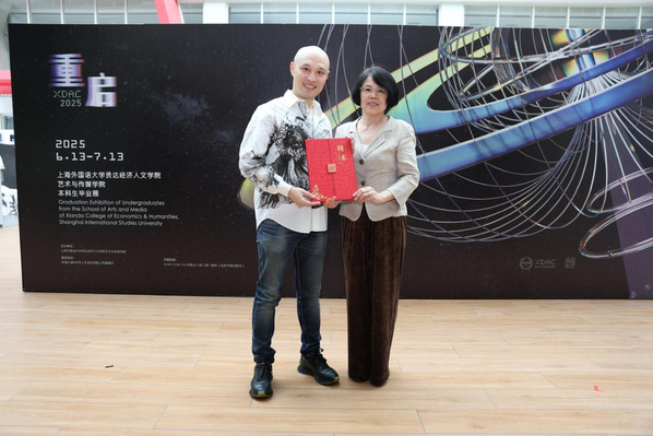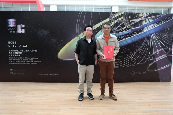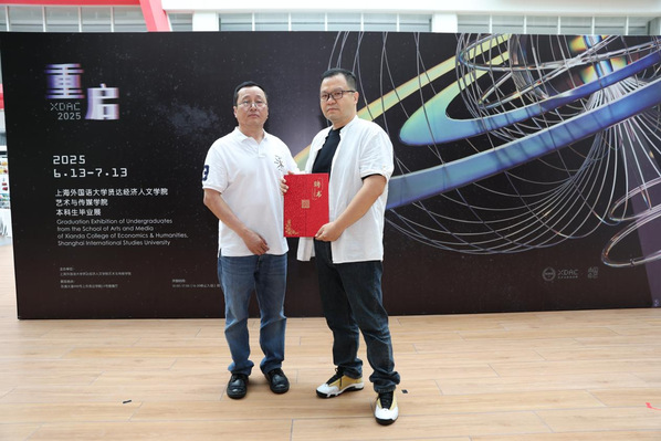 6月21日,上外贤达艺术与传媒学院在崇明校区13号楼一楼大厅举行2025届毕业作品展开幕式。本次毕业作品展围绕“重启:跨越边界的生长”主题,来自五大专业学子的77组优秀毕业作品集中亮相,全方位呈现了毕业生们扎实的专业功底与丰硕的创作成果。董事长鲍贤嗣、监事长陆朴鸣、总督学皋玉蒂,艺术与传媒学院领导班子、学院学术委员会委员、系主任、骨干教师,近30家企业代表、媒体记者及师生约200人共同见证这场盛会的开启,并参观了作品展。