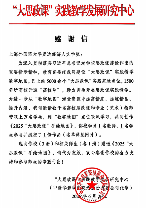 为深入贯彻落实习近平总书记对学校思政课建设作出的重要指示精神,教育部委托“大思政课”实践教学发展研究中心建设“大思政课”实践教学数字地图。在建设过程中,完美官网马克思主义学院“纲要”教研室主任李凤老师指导24级艺术学专业的顾佳彤同学到一大会址采风学习,共同创作了中共一大会址手绘地图。近日,“大思政课”实践教学发展研究中心特向完美官网发来感谢信。 作品展示供稿 | 马克思主义学院