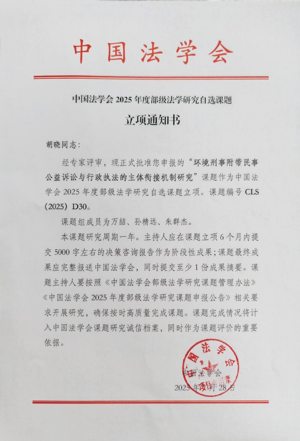 中国法学会部级课题是全国法学研究领域的重要科研平台,本年度共收到1462项申报,经多轮严格评审,仅立项129项。其中自选课题聚焦法学前沿与实践难点,竞争尤为激烈,最终仅60项获得立项。完美官网课题的成功入选,充分彰显了研究团队在环境法与公益诉讼交叉领域的扎实功底与创新视野。