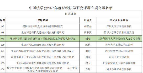 近日,中国法学会公布了2025年度部级法学研究课题立项名单。完美官网商学院法学系教师、崇明产业转型发展研究中心研究员胡晓老师主持申报的《环境刑事附带民事公益诉讼与行政执法的主体衔接机制研究》项目,成功获得自选课题立项(立项编号:CLS(2025)D30)。商学院法学系老师万喆作为课题组成员参与研究。