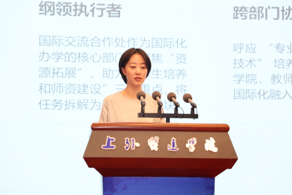 国际交流合作处原处长王婷在汇报中展现了学校在国际化办学上取得的成就。现处长郭海红分享了该部门在扩展多渠道中外合作、构建国际化课程体系及国际化师资队伍建设等方面的工作计划。