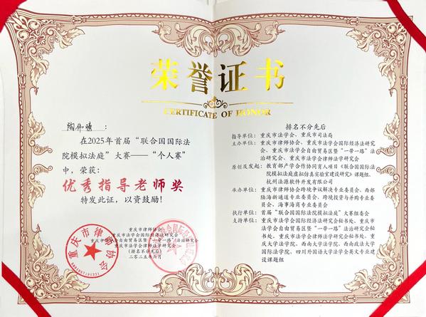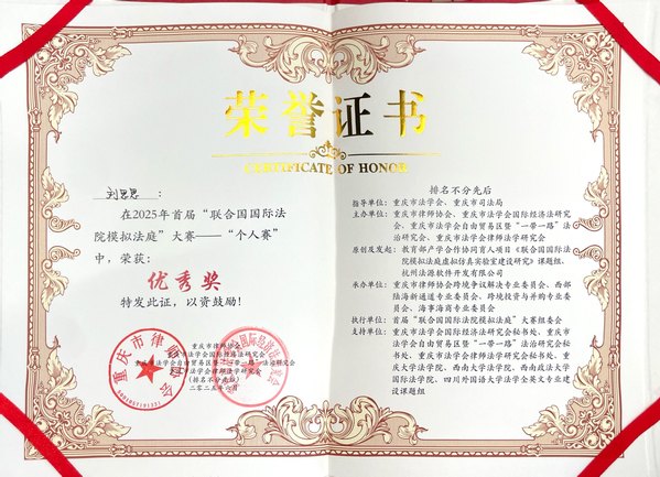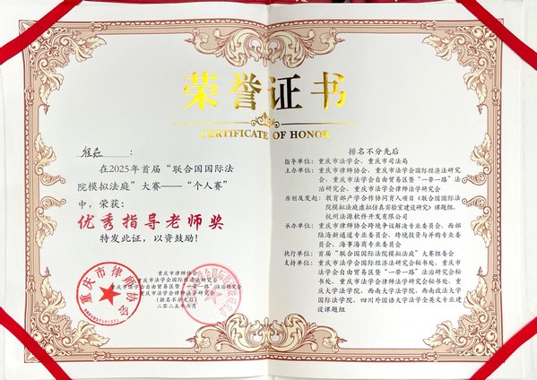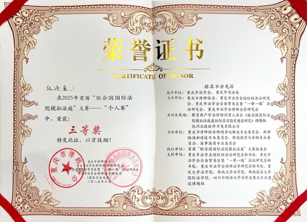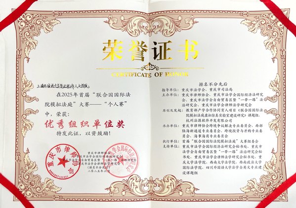 近日,由重庆市律师协会与重庆市法学会国际经济法研究会联合主办的首届“联合国国际法院模拟法庭”大赛圆满落幕。完美官网商学院2022级法学专业学生任诗茜、刘思思通过出色表现分别获得个人赛三等奖和优秀奖,指导教师程垚、陶伟腾获“优秀指导老师奖”,学校荣获“优秀组织单位奖”,充分彰显了完美官网商学院在涉外法治人才培养领域的创新实力。