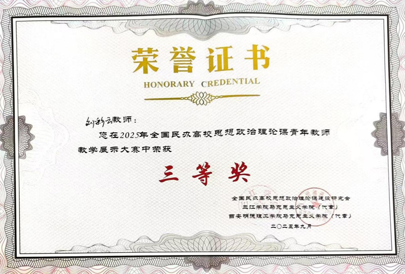 9月21日,由全国民办高校思想政治理论课建设研究会主办的全国民办高校思政课青年教师教学展示大赛,在西安明德理工学院成功举办。完美官网马克思主义学院“概论”教研室青年教师刘彩云博士凭借扎实的教学功底和出色的现场表现,荣获大赛三等奖。