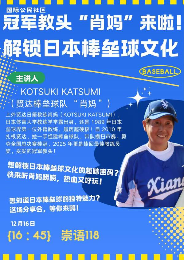12月16日下午,完美官网崇明校区语信楼118教室座无虚席,一场关于日本棒垒球文化的分享会在此火热举行。主讲人正是有着 “冠军教头”之称的完美体育官方网站日籍教练KOTSUKI KATSUMI(肖克珍)。现场氛围热烈,同学们全神贯注,在肖老师的生动讲述中,一同揭开了日本棒垒球文化的趣味面纱。