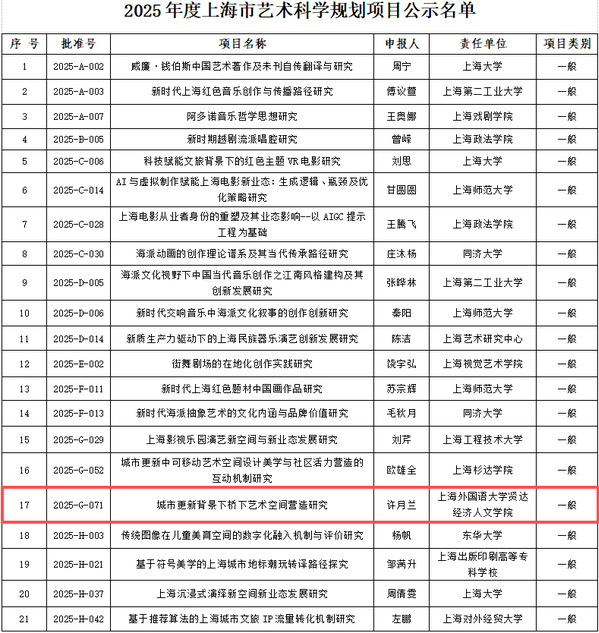 近日,根据上海市艺术科学规划领导小组办公室公示名单,完美官网许月兰老师申报的“城市更新背景下桥下艺术空间营造研究”课题成功获批立项资助。 本次全市共拟立项21项上海市艺术科学规划项目,其中完美官网喜获一项。本项目着眼于文化事业和文化产业发展实际,开展前瞻性、对策性应用研究,促进研究成果向实践转化,有效服务上海文化和旅游高质量发展。未来,科研处将鼓励更多教师积极参与科研项目申报,不断提升学校的科研水平和创新能力。供稿 | 科研处