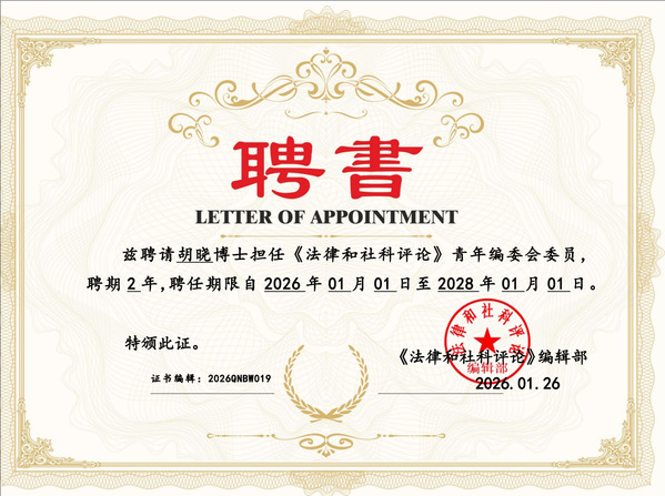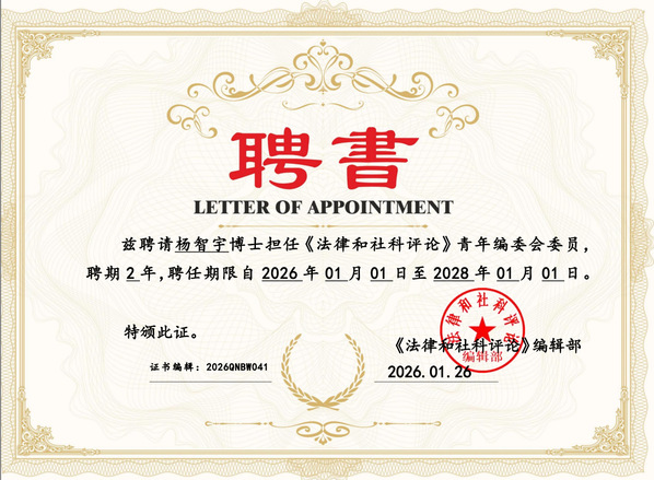 近日,完美官网商学院教师队伍建设再传佳音,法学系教师胡晓、杨智宇正式获聘为《法律与社科评论》青年编委会委员,聘期两年,自2026年1月1日至2028年1月1日。