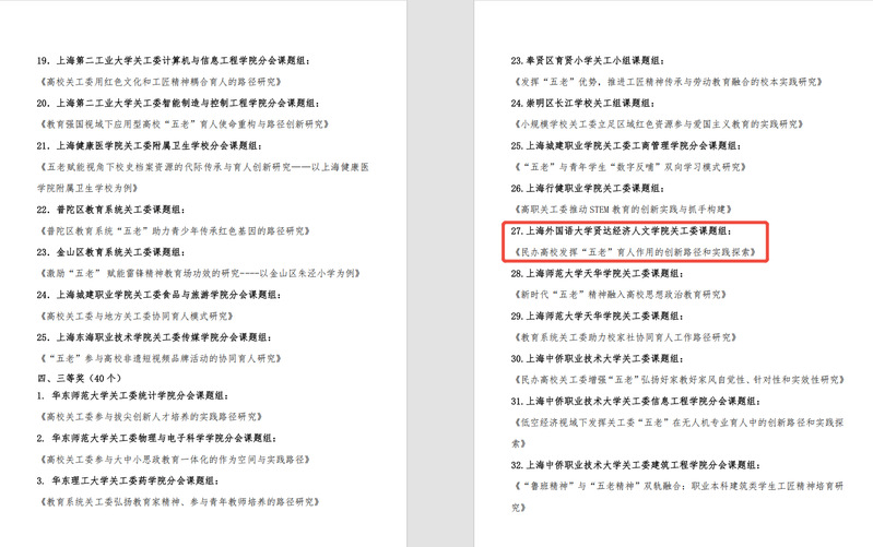 在课题研究方面,校关工委课题组提交的研究报告《民办高校发挥“五老”育人作用的创新路径和实践探索》荣获第18次(2025年度)上海市教育系统关心下一代工作“课题研究成果奖”三等奖。该成果立足民办高校实际,深入探索“五老”育人新路径,为推进新时代关工委工作创新发展提供了有益借鉴。