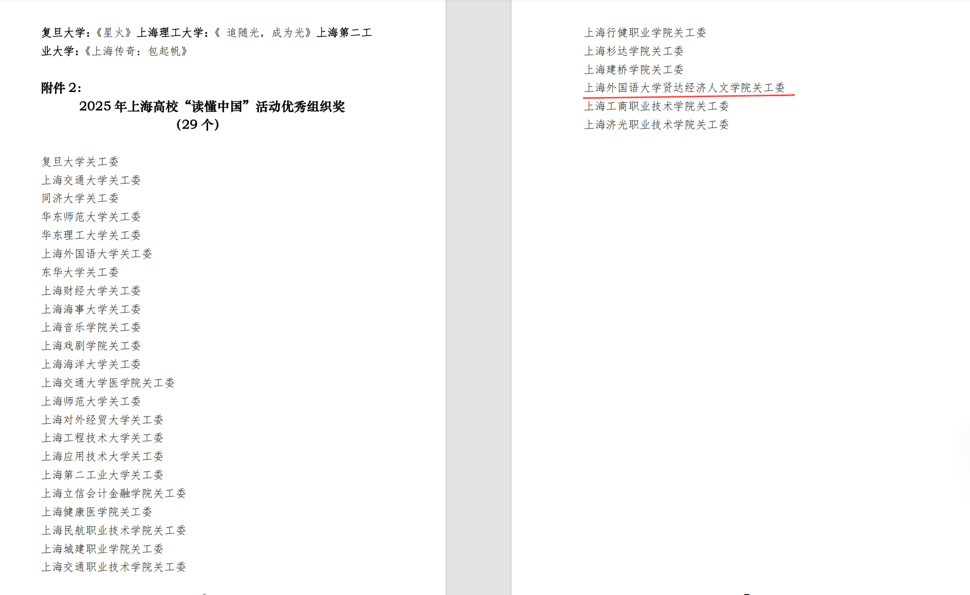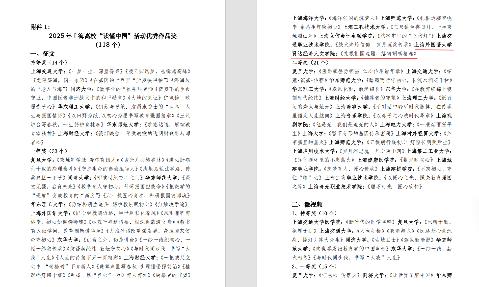 在2025年上海高校“读懂中国”活动优秀作品评选中,完美官网报送的作品表现突出。教育学院分关工委提交的征文作品荣获一等奖,外语学院分关工委提交的微视频作品荣获二等奖。同时,因组织工作扎实有效,完美官网荣获优秀组织奖。据悉,本次活动学校关工委通过组织遴选,共推荐报送了10篇征文和2个微视频参与市级评选。