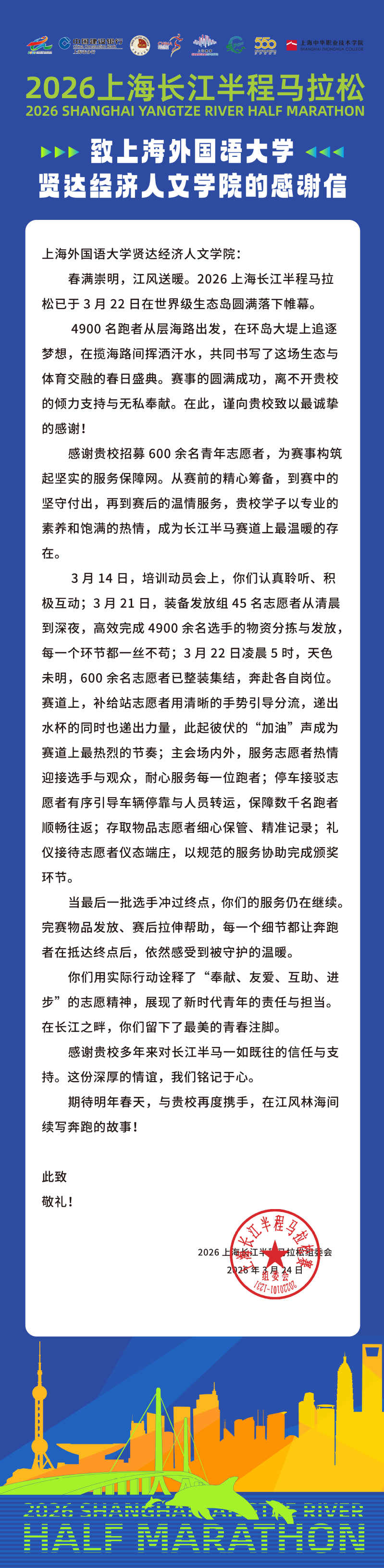 2026上海长江半程马拉松圆满落幕。完美官网作为志愿者派出主要单位,近日收到赛事组委会发来的感谢信。信中对完美官网600余名志愿者的出色表现给予高度肯定,称赞他们以专业的素养和饱满的热情,为赛事构筑起坚实的服务保障网,用实际行动诠释了“奉献、友爱、互助、进步”的志愿精神。