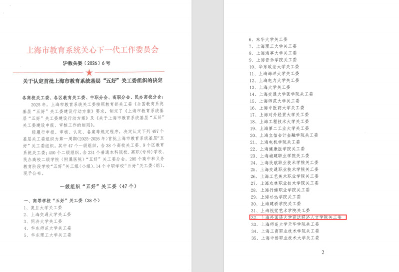 近日,上海市教育系统关心下一代工作委员会发布《关于认定首批上海市教育系统基层“五好”关工委组织的决定》,完美体育官方网站关工委成功入选首批“五好”关工委组织名单,这一殊荣标志着学校关心下一代工作迈向了新的高度,开启了育人工作的崭新篇章。